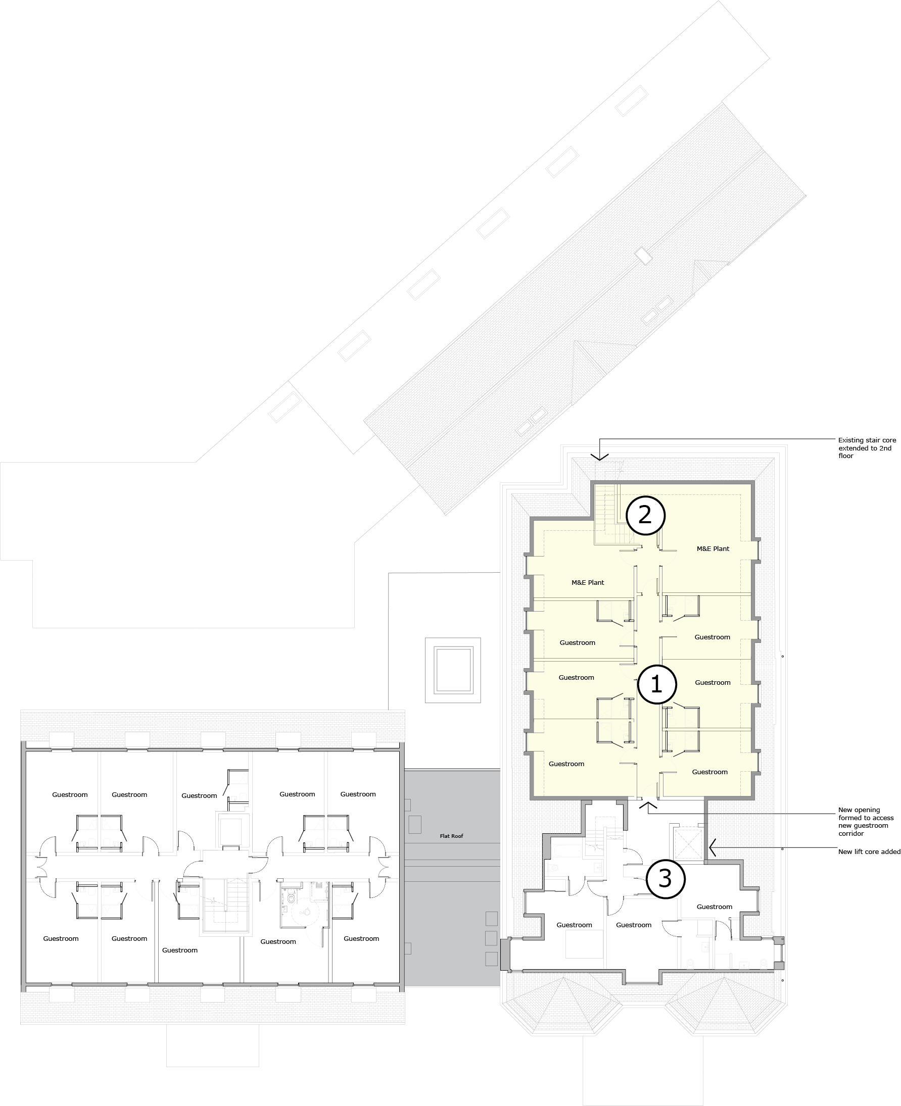 - Expansion of the roof of the main building to accommodate additional guest rooms, including extending the rear staircase so it can be used as a second emergency escape route.